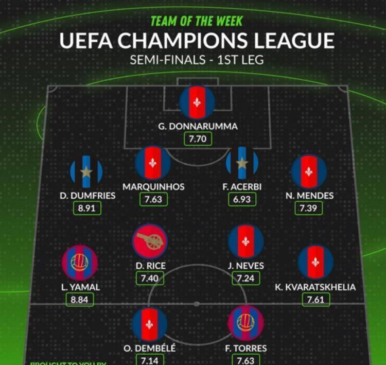 紧接着再来看后防地,两个边后卫位置分辨给到了国米的邓弗里斯,以及大巴黎的努诺门德斯。邓弗里斯不必多说,对阵巴萨独造三球可以说是完满发扬。越到大局面邓弗里斯的证实就越矜重,这小数让不少球迷感到有时。他拿下一个位置实至名归。同期努诺门德斯在首回合对阿森纳防地的冲击力度稀奇足,这也让球队获取了先机。